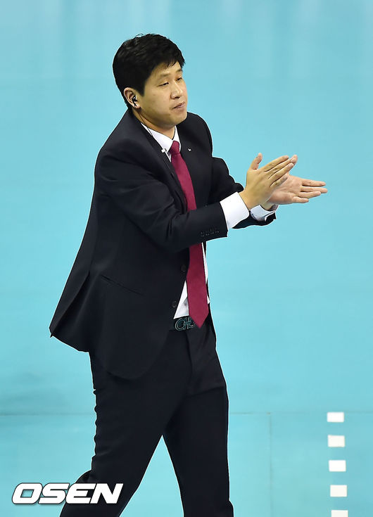 18일 오후 경상북도 구미시 광평동 박정희체육관에서 열린 '2014-2015 NH농협 V-리그' LIG손해보험과 대한항공의 경기, 4세트 대한항공 김종민 감독이 박수를 보내고 있다.