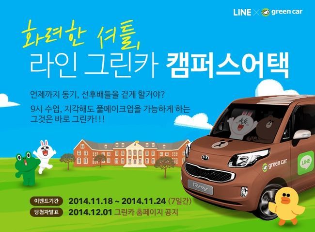 국내 카셰어링 업계 1위 그린카에서 마련한 이번 이벤트는 모바일 메신저 라인(LINE)의 인기 캐릭터를 기아차 레이(Ray)로 랩핑한 라인 그린카의 캠퍼스 무료 운행을 놓고 펼쳐지는 온라인 학교 대항전이다. 오는 24일까지 그린카 홈페이지를 통해 진행되며 그린카 회원이라면 누구나 참여 가능하다.