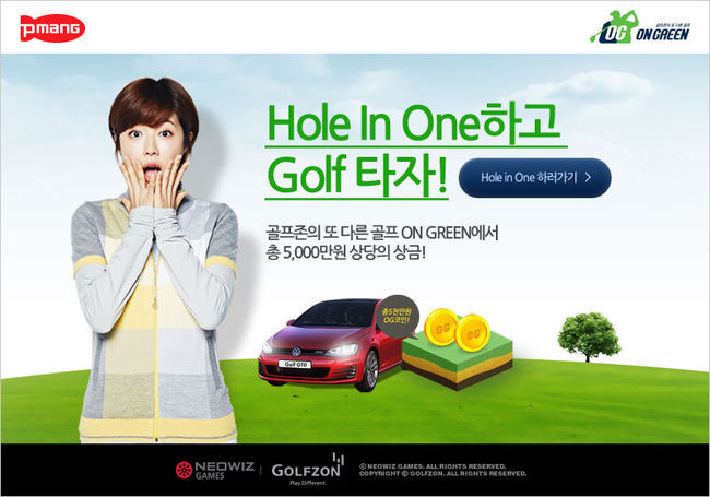 (주)골프존엔터테인먼트(대표 김효겸)가 개발하고 네오위즈게임즈(대표 이기원)의 게임포털 피망과 골프존닷컴 홈페이지를 통해 서비스 중인 신작 온라인 골프 게임 '온그린(On Green, 이하 OG)'이 18일부터 총 5000만 원 상당의 OG코인을 지급하는 홀인원(Hole In One) 이벤트를 진행한다.