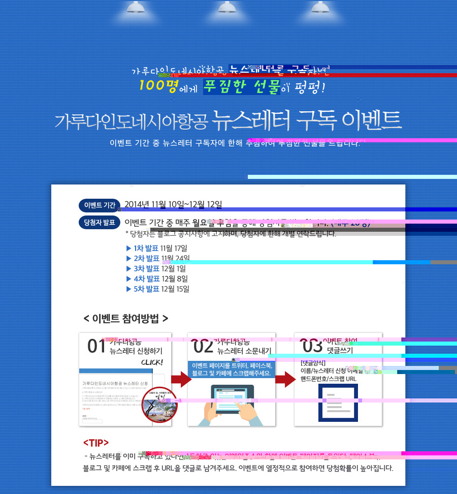 12월 12일까지 진행되는 이번 이벤트의 참여방법은 뉴스레터 구독 신청 후, 이벤트 페이지를 트위터, 블로그, 페이스북 및 카페에 스크랩한 뒤, 가루다항공 블로그(http://blog.naver.com/ga_mkt/220177204572) 또는 페이스북(https://www.facebook.com/garudaindonesia.KR)에 참여 댓글을 남기면 된다.