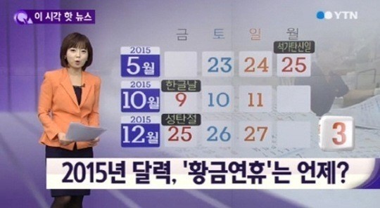연말이 다가오면서 2015년 달력이 네티즌 관심을 집중시키고 있다. 2015년 달력을 살펴보면 공휴일이 66일이다. 올해보다 이틀 적어 아쉬움(?)을 남기고 있다. 그러나 특히 설연휴는 무려 9일까지 쉴 수 있어 더욱 화제다.