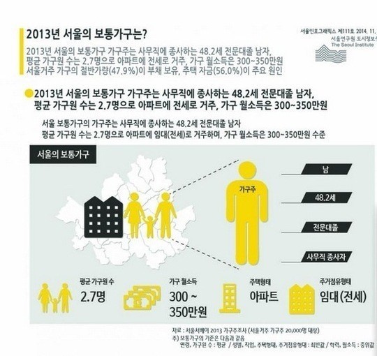 언론 보도에 따르면 지난해 기준으로 서울 가구주는 전문대를 나와 사무직에서 일하는 48.2세 남자인 것으로 조사됐다.