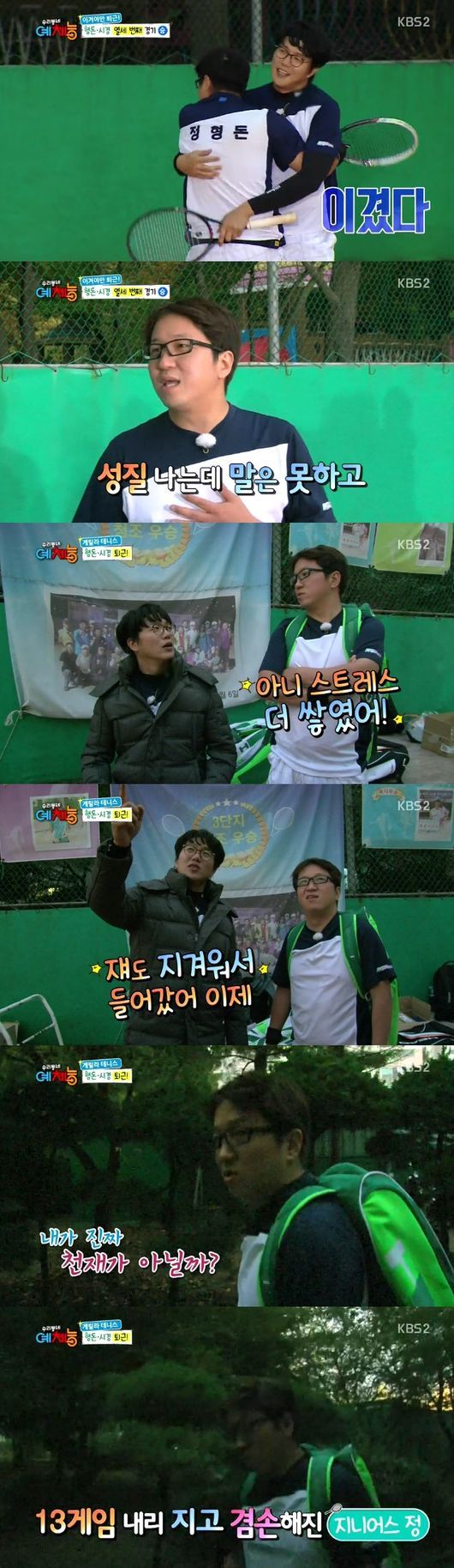 그러면서 정형돈은 “나는 쓰레기야”라고 자학, 자발적으로 레슨을 받겠다고 말했다. 이어 정형돈은 “춘천 경기로 내가 진짜 테니스 천재가 아닐까 싶었다. 그런데 정말 거지같은 생각이었다”며 겸손한 모습을 보였다.