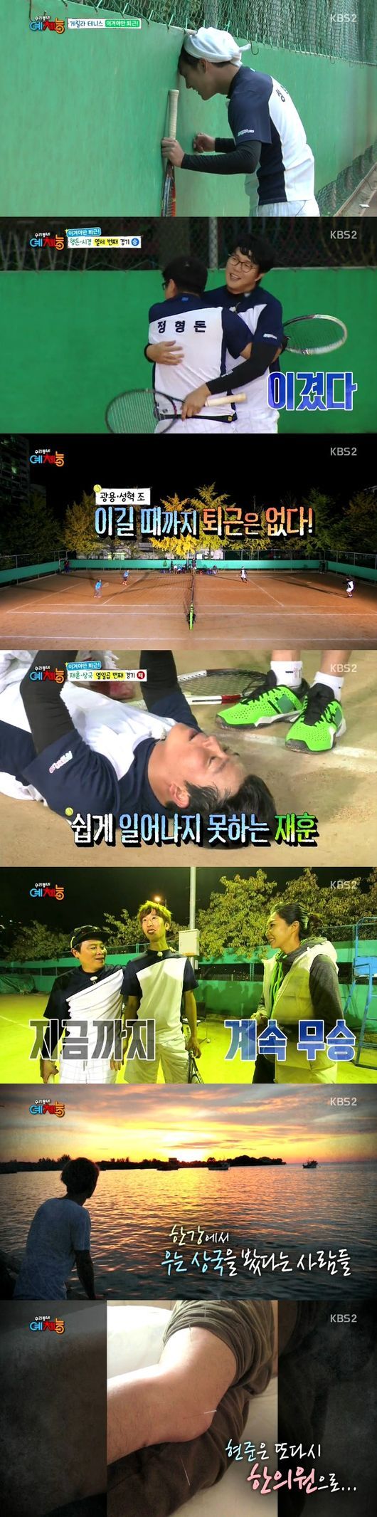 18일 오후 방송된 KBS 2TV '우리동네 예체능' 80회에는 지난주에 이어 동네 테니스 고수들과 밤샘 테니스 경기를 펼치는 예체능팀(이형택, 전미라, 강호동, 정형돈, 신현준, 성시경, 이규혁, 차유람, 이재훈, 양상국, 성혁, 이광용)의 모습이 전파를 탔다.