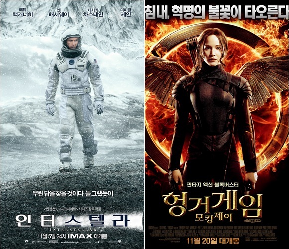 국내 극장가에서 흥행 독주 중인 영화 '인터스텔라'가 신작 '헝거게임:모킹제이'의 개봉에 얼마나 영향을 받을 지 주목된다.