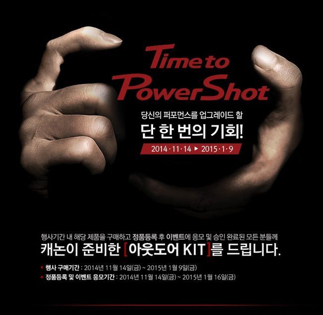 'Time to PowerShot' 이벤트는 캐논의 고성능 하이엔드 컴팩트 카메라 구입을 준비하고 있는 소비자들에게 야외에서 촬영 시 유용하게 사용할 수 있는 아웃도어 KIT을 증정해 풍부한 사진생활을 즐길 수 있는 기회를 제공하고자 마련됐다.