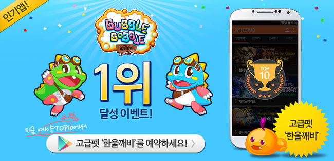 스코넥 엔터테인먼트는 ‘보글보글 for Kakao’의 1위를 기념하기 위해 사전예약 전문 어플리케이션 ‘예약TOP10’에서 고급펫 ‘한울깨비’의 사전예약 이벤트를 실시한다.