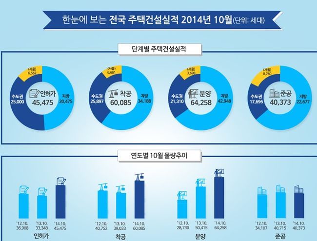 국토교통부가 발표한 19일 자료에 따르면 10월 주택 인허가 실적은 전국 4만 5475세대로 전년동월대비 36.4% 증가한 것으로 조사됐다. 이는 지난 1월부터 전년동월대비 상승세를 유지하고 있는 것이다.