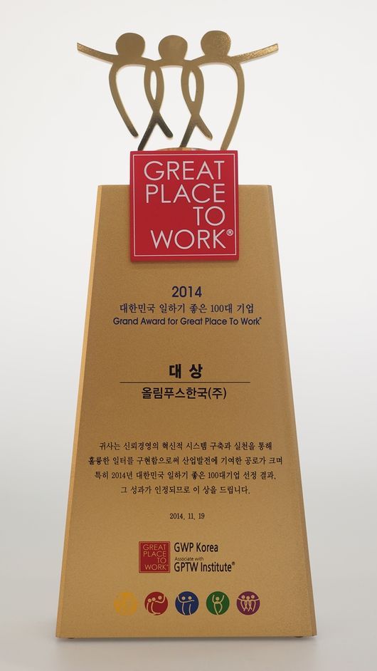올림푸스한국은 GWP코리아와 한국지식재산상업화협회가 주관하는 제 13회 ‘2014 일하기 좋은 100대 기업’ 외국계 부문 대상을 수상했다고 19일 밝혔다.