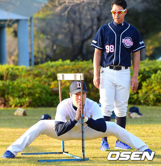 두산 박건우와 홍재용이 유연성 훈련을 진행하고 있다.
