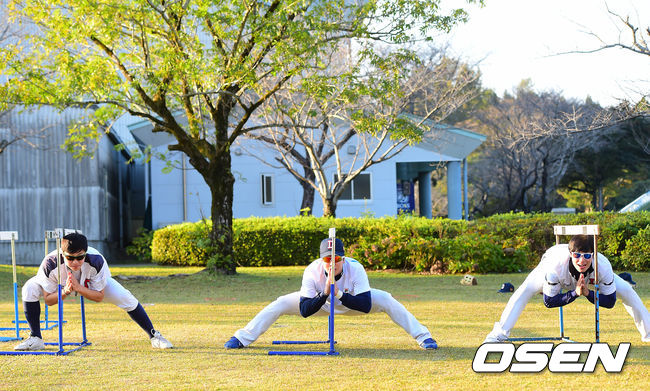 두산 정수빈, 박건우, 민병헌이 유연성 훈련을 진행하고 있다.