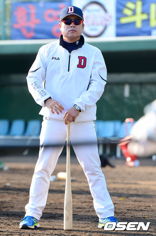 두산 김태형 감독이 선수들의 훈련을 지켜보고 있다.