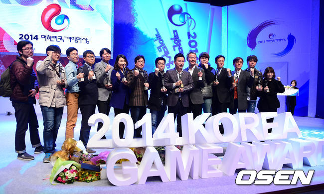 19일 오후 부산 영화의전당에서 열린 2014 대한민국 게임대상에서 수상자들이 기념촬영을 하고 있다.