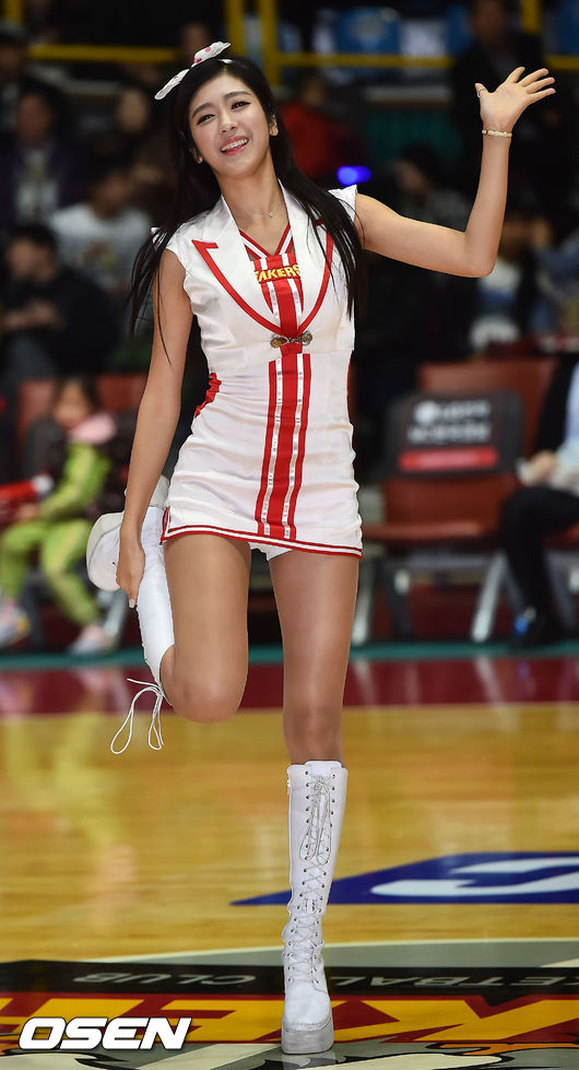 19일 오후 경상남도 창원시 의창구 창원실내체육관에서 열린 '2014-2015 KCC 프로농구' 창원 LG와 원주 동부와의 경기, 오프닝 공연때 LG 치어리더 김연정이 코트 위에서 공연을 펼치고 있다.