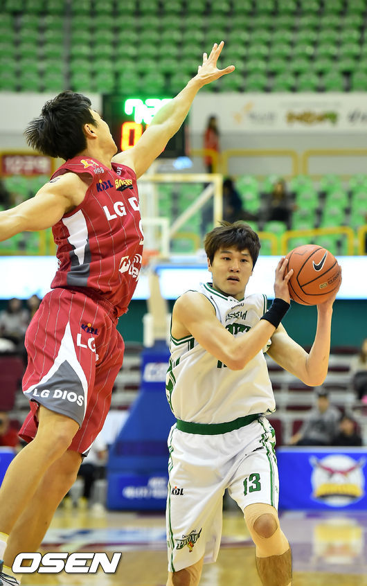 19일 오후 경상남도 창원시 의창구 창원실내체육관에서 열린 '2014-2015 KCC 프로농구' 창원 LG와 원주 동부와의 경기, 1쿼터 동부 윤호영이 페이크 모션으로 속이고 있다.
