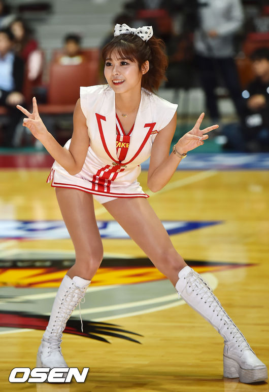 19일 오후 경상남도 창원시 의창구 창원실내체육관에서 열린 '2014-2015 KCC 프로농구' 창원 LG와 원주 동부와의 경기, 오프닝 공연때 LG 치어리더 송윤화가 코트 위에서 공연을 펼치고 있다.