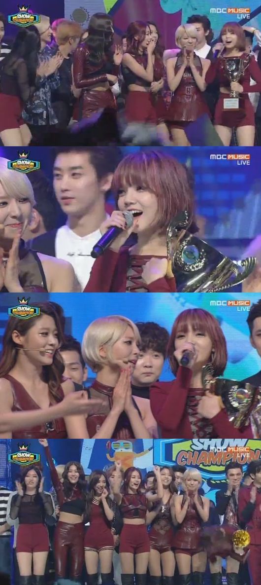 AOA는 19일 오후 방송된 MBC뮤직 '쇼!챔피언'에서 신곡 '사뿐사뿐'으로 챔피언송을 차지했다.