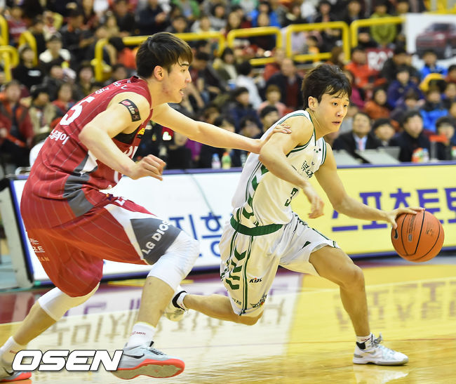 19일 오후 경상남도 창원시 의창구 창원실내체육관에서 열린 '2014-2015 KCC 프로농구' 창원 LG와 원주 동부와의 경기, 2쿼터 동부 허웅이 LG 김종규를 돌파하고 있다.