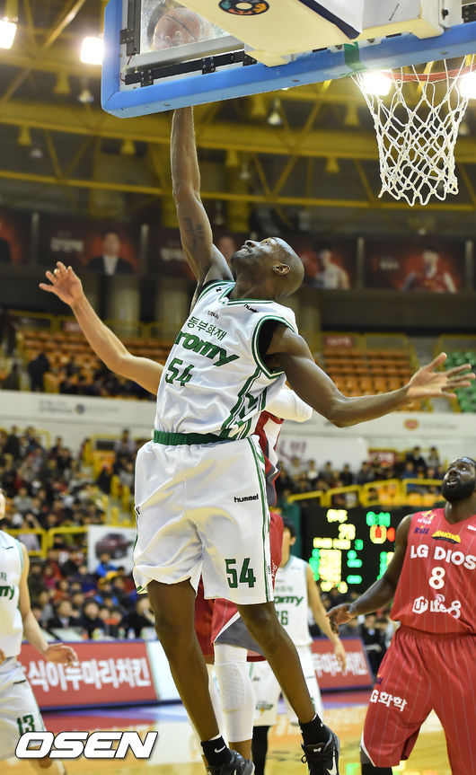 19일 오후 경상남도 창원시 의창구 창원실내체육관에서 열린 '2014-2015 KCC 프로농구' 창원 LG와 원주 동부와의 경기, 2쿼터 동부 리처드슨이 리바운드를 시도하고 있다.