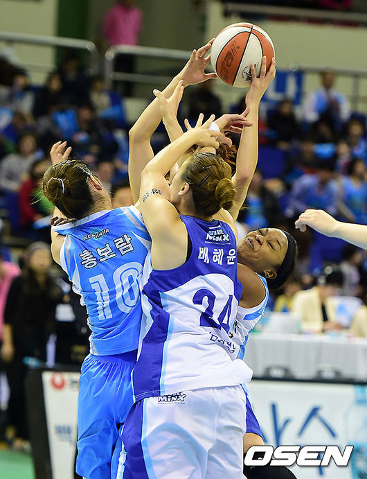 2쿼터 하나외환 홍보람, 심스가 배혜윤과 리바운드를 다투고 있다.
