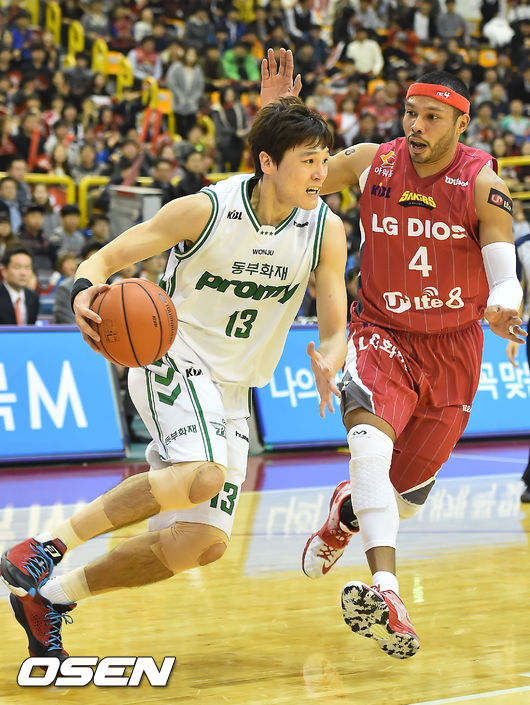 19일 오후 경상남도 창원시 의창구 창원실내체육관에서 열린 '2014-2015 KCC 프로농구' 창원 LG와 원주 동부와의 경기, 2쿼터 동부 윤호영이 LG 문태종을 돌파하고 있다.