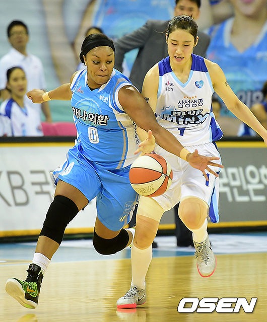 2쿼터 하나외환 심스가 삼성블루밍스 박하나의 볼을 가로채고 있다.
