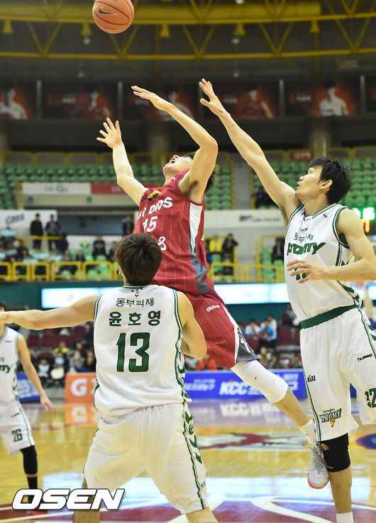 19일 오후 경상남도 창원시 의창구 창원실내체육관에서 열린 '2014-2015 KCC 프로농구' 창원 LG와 원주 동부와의 경기,3쿼터 동부 윤호영과 김주성이 LG 김종규를 블로킹을 하고 있다.