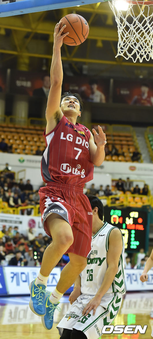 19일 오후 경상남도 창원시 의창구 창원실내체육관에서 열린 '2014-2015 KCC 프로농구' 창원 LG와 원주 동부와의 경기, 4쿼터 LG 양우섭이 속공에 성공하고 있다.