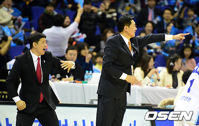 4쿼터 하나외환 박종천 감독과 신기성 코치가 선수들을 독려하고 있다.