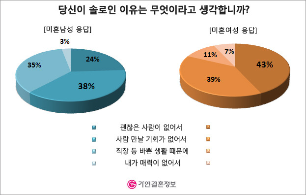 미혼남성 응답자는 38%가 '내가 솔로인 이유'로 '사람 만날 기회가 없어서'라고 답변했다. 2위는 35%를 차지한 '직장 등 바쁜 생활 때문에'였다. 24%는 '괜찮은 사람이 없어서', 3%가 '내가 매력이 없어서'라고 응답했다.
