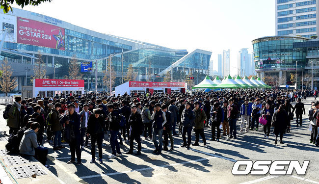 20일 오전 부산 벡스코(BEXCO)에서 '지스타 2014' 입장권을 구하려는 관람객들이 줄을 서 있다.