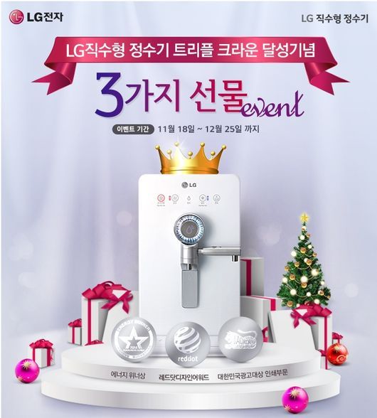 LG전자는 직수형 정수기가 '올해의 에너지 위너상', '레드닷(Reddot) 디자인 어워드', '대한민국 광고 대상' 등 서로 다른 분야의 시상식에서 3관왕을 달성한 것을 기념해 오는 12월 25일까지 '산타가 주는 세가지 선물' 이벤트를 진행한다.