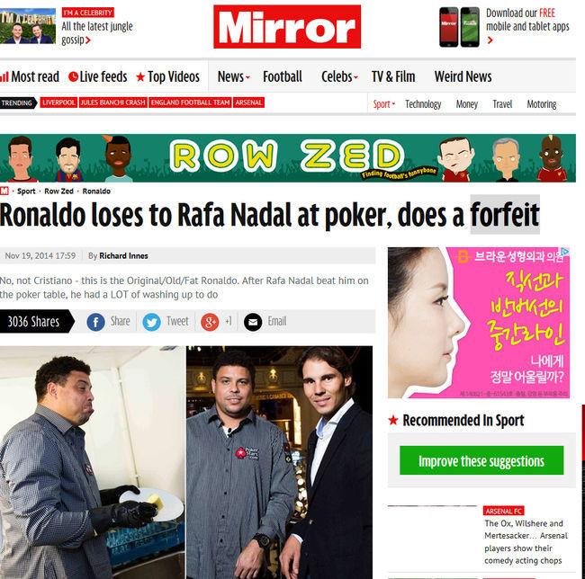 호나우두가 테니스 스타 라파엘 나달과 포커대결에서 고개를 숙였다. 20일(이하 한국시간) 영국 매체 '미러'는 "호나우두가 나달과 포커를 해서 패배했다"고 보도하며 "크리스티아누가 아니다. 원조이면서 나이를 먹고 살찐 호나우두가 나달과 포커를 했지만 패배해 설거지를 했다"고 전했다.