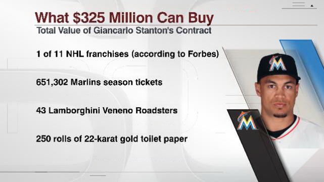 3억 2500만 달러가 있으면 NHL(북미아이스하키리그) 구단 11개 중 하나를 매입할 수 있다. 또한 스탠튼이 소속팀인 마이애미의 시즌 티켓을 65만 1302장이나 구매 가능하다. 자동차로 환산하면 최고급인 람보르기니의 베네노 로드스터스 43대, 22캐럿짜리 금으로 된 화장지라면 250롤을 살 수 있다.