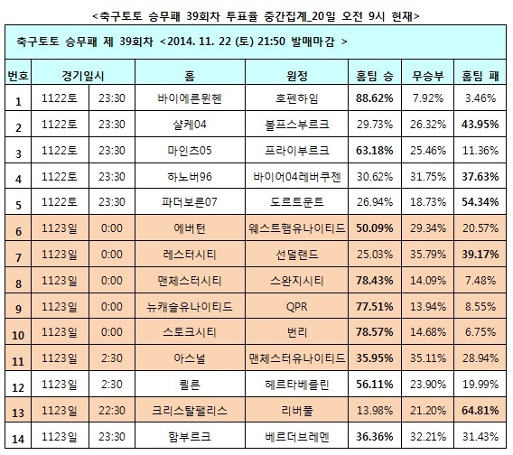 이 밖에도 최근 주춤하고 있는 맨체스터시티가 지난 라운드 아스널을 잡고 상승세를 탄 스완지시티를 상대로 승리를 거둘 것이라 예측한 축구팬들이 78.43%나 되는 것으로 집계됐고, 2007년 이후 에버턴을 상대로 한번도 승리하지 못했던 웨스트햄이, 시즌 초반 좋은 흐름에도 불구하고 에버턴의 벽을 뛰어넘지 못할 것이라 예상이 50.09%로 나타났다.