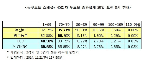 투표율을 살펴보면, KT와 동부 모두 70~79점대가 각각 35.77%와 50.30%로 1순위를 차지한 것으로 나타났다.
