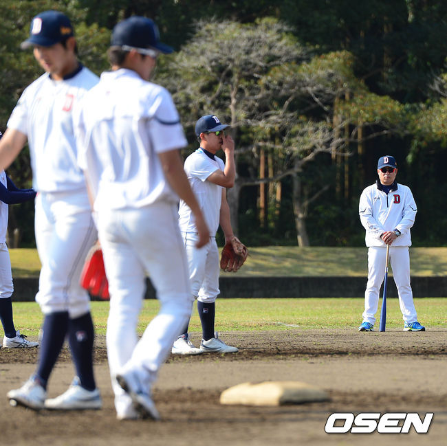 두산 김태형 감독이 선수들의 수비 훈련을 지켜보고 있다.