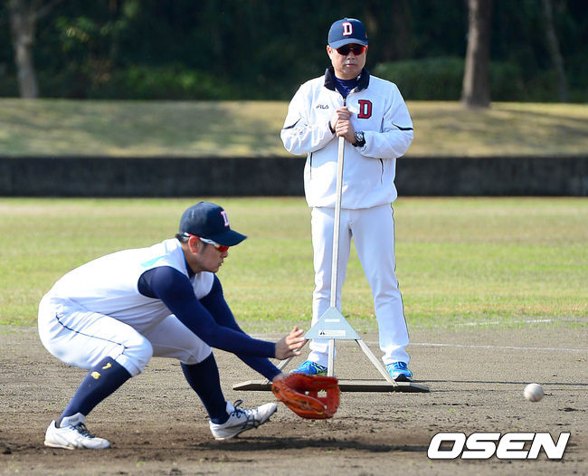 두산 김태형 감독이 선수들의 수비 훈련을 지켜보고 있다.