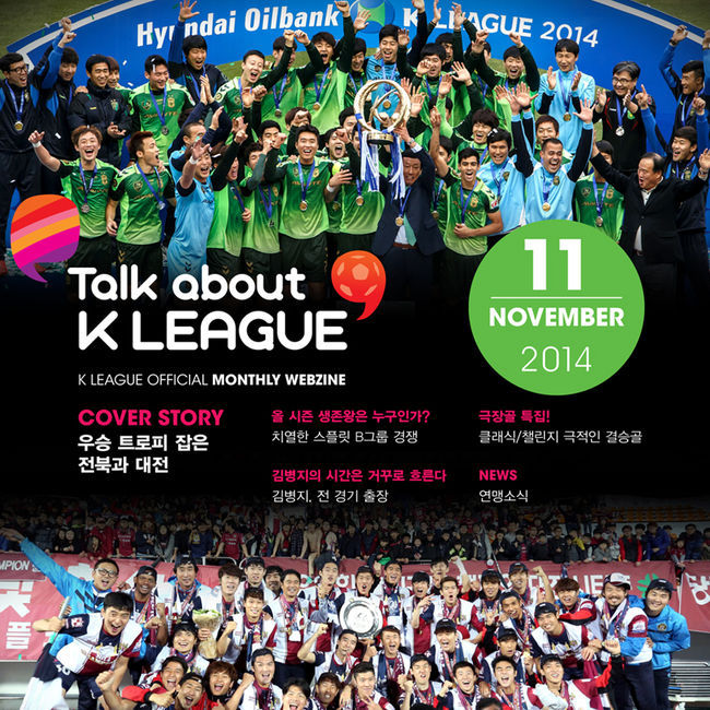 한국프로축구연맹(총재 권오갑, 이하 연맹)은 20일 현대오일뱅크 K리그 클래식 우승팀 전북현대, 현대오일뱅크 K리그 챌린지 우승팀 대전 시티즌의 우승 스토리와 클래식 그룹B의 치열한 강등전쟁 기록 등을 담은 K리그 공식 웹진 ‘Talk about KLEAGUE’ 11월호를 발간했다.