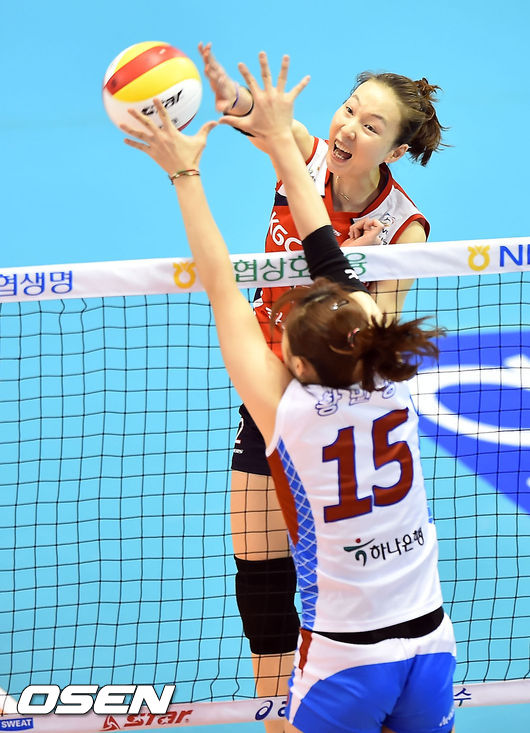 20일 오후 대전시 중구 부사동 충무실내체육관에서 열린 '2014-2015 NH농협 V-리그' 여자부 KGC인삼공사와 한국도로공사의 경기, 1세트 KGC인삼공사 백목화가 강타를 날리고 있다.