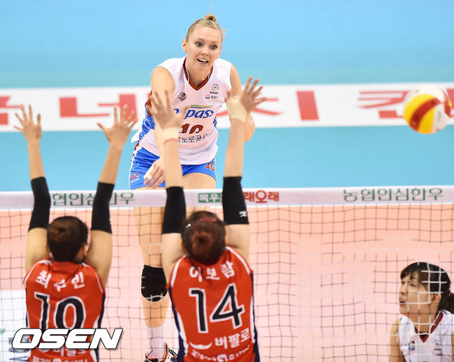 20일 오후 대전시 중구 부사동 충무실내체육관에서 열린 '2014-2015 NH농협 V-리그' 여자부 KGC인삼공사와 한국도로공사의 경기, 1세트 한국도로공사 니콜이 강타를 날리고 있다.