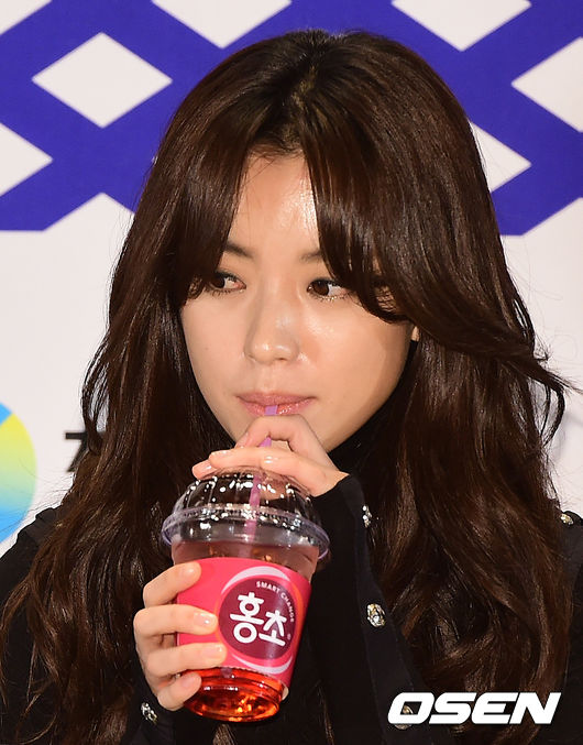 배우 한효주가 무대에서 음료를 마시고 있다.