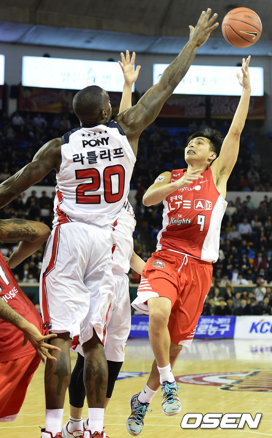 20일 오후 서울 잠실학생체육관에서 열린 '2014-2015 KCC 프로농구 2라운드' 서울 SK나이츠와 울산 모비스 피버스의 경기, 2쿼터 주희정이 모비스 라틀리프의 수비를 피해 훅슛을 시도하고 있다.