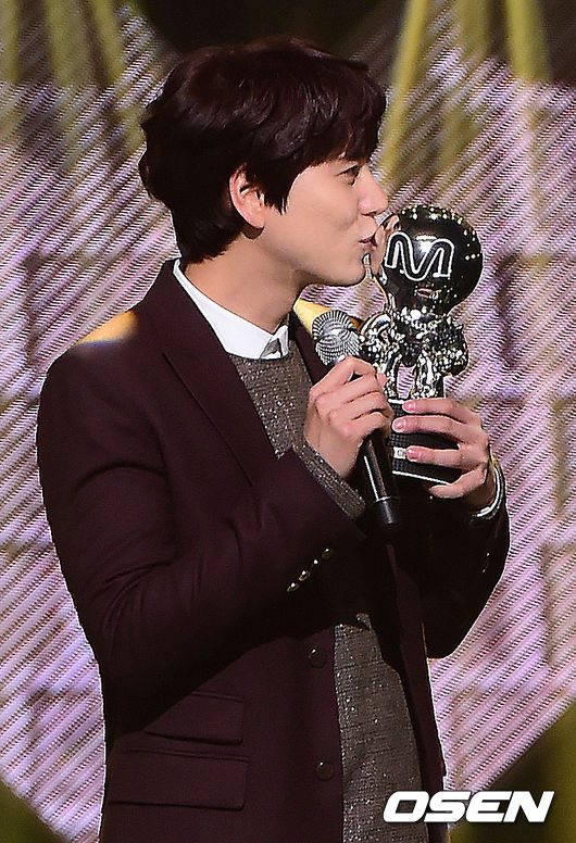 20일 오후 서울 상암동 CJ E & M 센터에서 열린 Mnet '엠카운트다운'(이하 엠카) 생방송에서 1위를 차지한 규현이 세레머니를 하고 있다.
