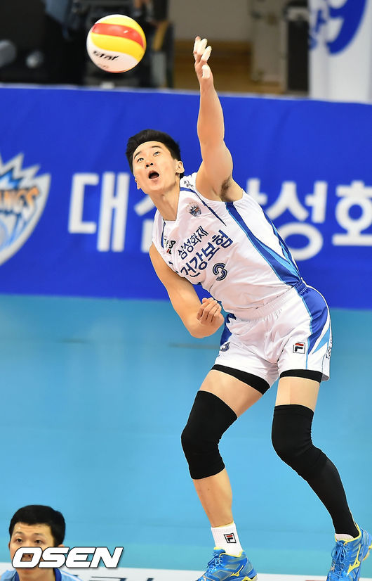 20일 오후 대전시 중구 부사동 충무실내체육관에서 열린 '2014-2015 NH농협 V-리그' 남자부 삼성화재와 OK저축은행의 경기, 1세트 삼성화재 박철우가 27-26의 상황에서 서브 에이스를 성공시키며 1세트를 따내고 있다.
