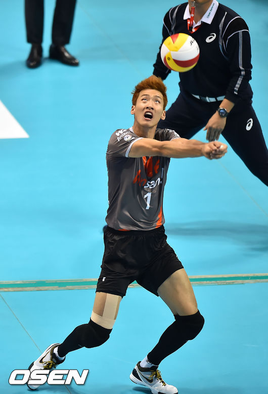 20일 오후 대전시 중구 부사동 충무실내체육관에서 열린 '2014-2015 NH농협 V-리그' 남자부 삼성화재와 OK저축은행의 경기, 1세트 OK저축은행 송명근이 볼을 살려내고 있다.