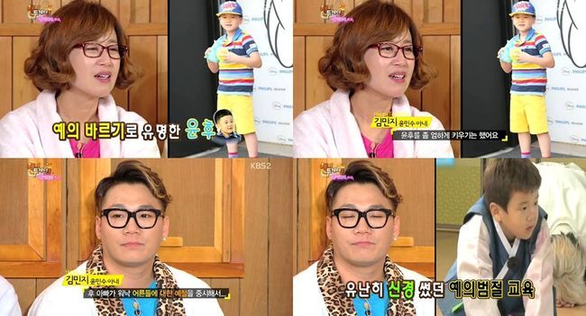 가수 윤민수의 아내가 아들 윤후의 예의범절에 특별히 신경을 쓴다고 밝혀 눈길을 끌었다.