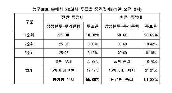 최종 삼성블루 50점대-우리은행 60점대 20.62%로 최다 집계…22일(토) 오후 6시 50분 마감