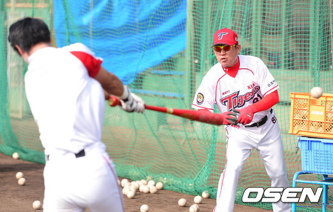 KIA 조계현 코치가 선수들에게 배팅볼을 던지고 있다.
