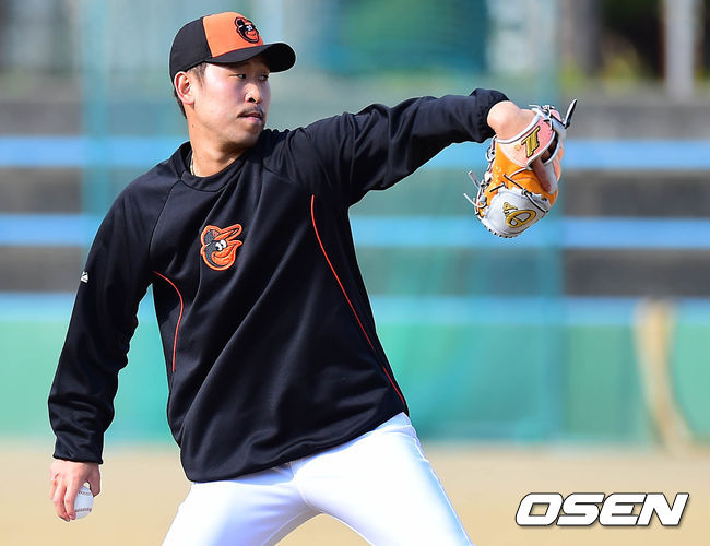 KIA 마무리캠프에 합류한 미국 메이저리그 볼티모어 윤석민이 캐치볼로 몸을 풀고 있다.